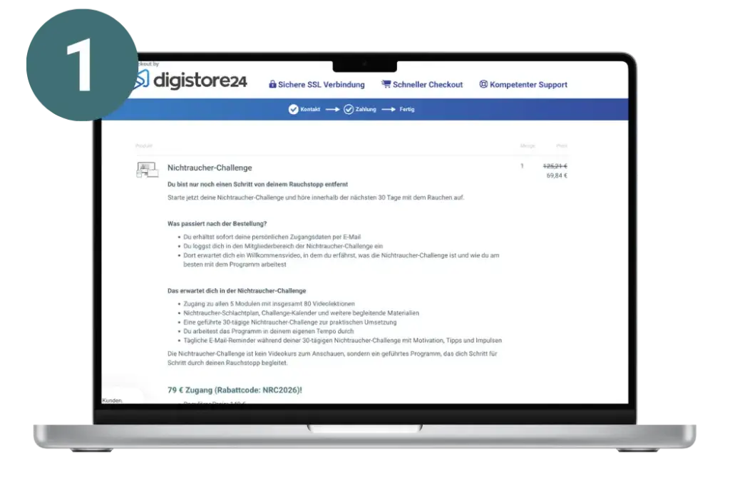 Sobald du die Zahlung abgewickelt hast, erhältst du sofortigen Zugang zum Mitgliederbereich der Nichtraucher-Challenge.