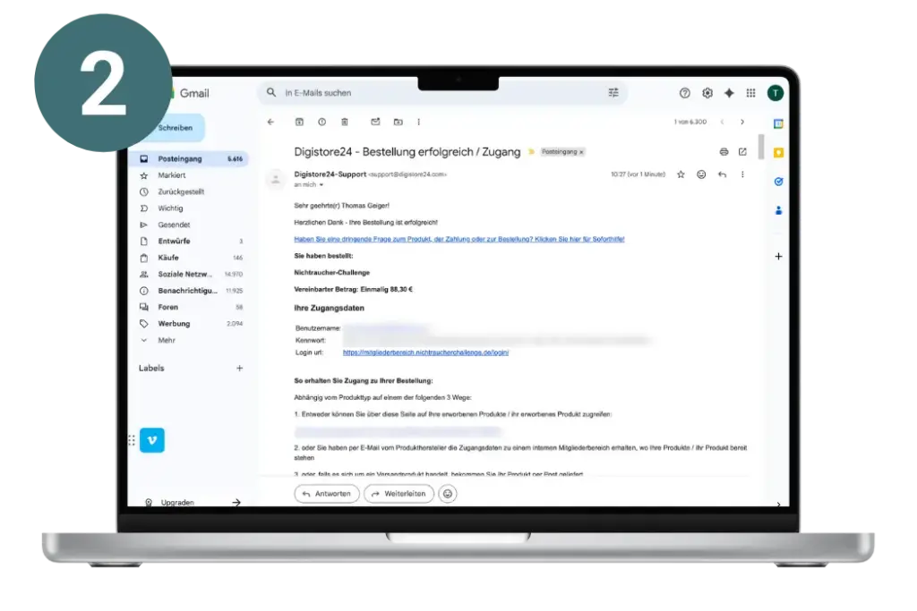 Nach erfolgreicher Bestellung bekommst du deine Zugangsdaten per E-Mail zugeschickt und kannst dich direkt in den Mitgliederbereich einloggen.