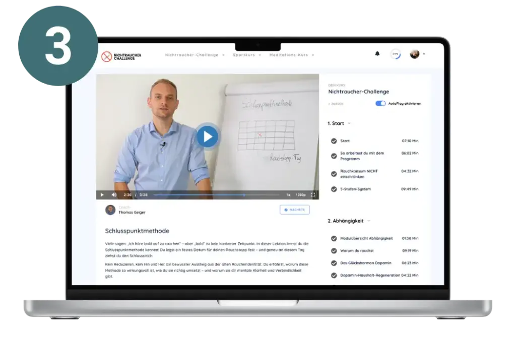 In 80 Videotrainings erfährst du alles, um erfolgreich mit dem Rauchen aufzuhören.
