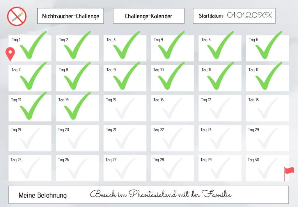 Und schließlich setzt du ihn in deiner 30-tägigen Nichtraucher-Challenge um – mit dem Ziel, nicht nur aufzuhören, sondern dauerhaft rauchfrei zu bleiben.