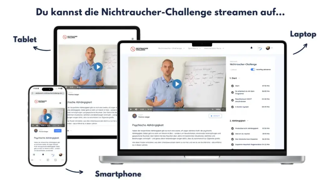 ✓ 80 Video-Lektionen ✓ Kurs Laufzeit über 6 h ✓ Kursbegleitende PDF’s & Übungen ✓ Jahres-Zugang zur Nichtraucher-Challenge ✓ Einmalige Zahlung ✓ Kein Abo ✓ Bewährte Strategien